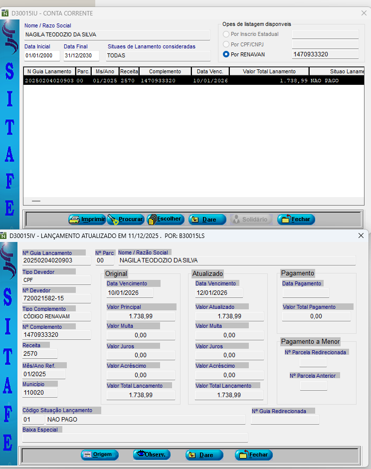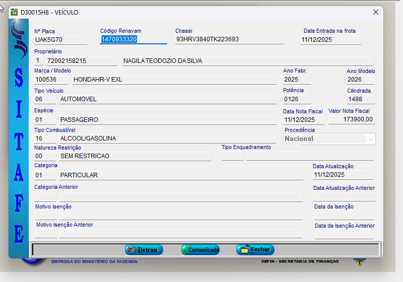 O contribuinte compareceu à Agência de Rendas para solicitar o lançamento do 1º emplacamento do veículo – RENAVAM 1470933320, placa UAK5G70.