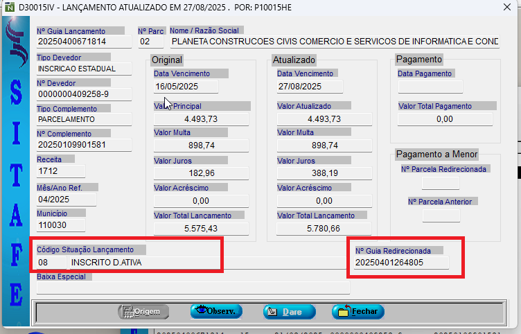Após isso, devolver OS para reativação do parcelamento e vinculação das arrecadações.