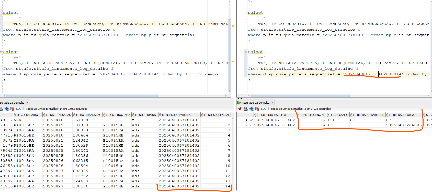 Ao realizar consulta nas tabelas de LOG_LANCAMENTO, não foram identificadas alterações indevidas nos registros.