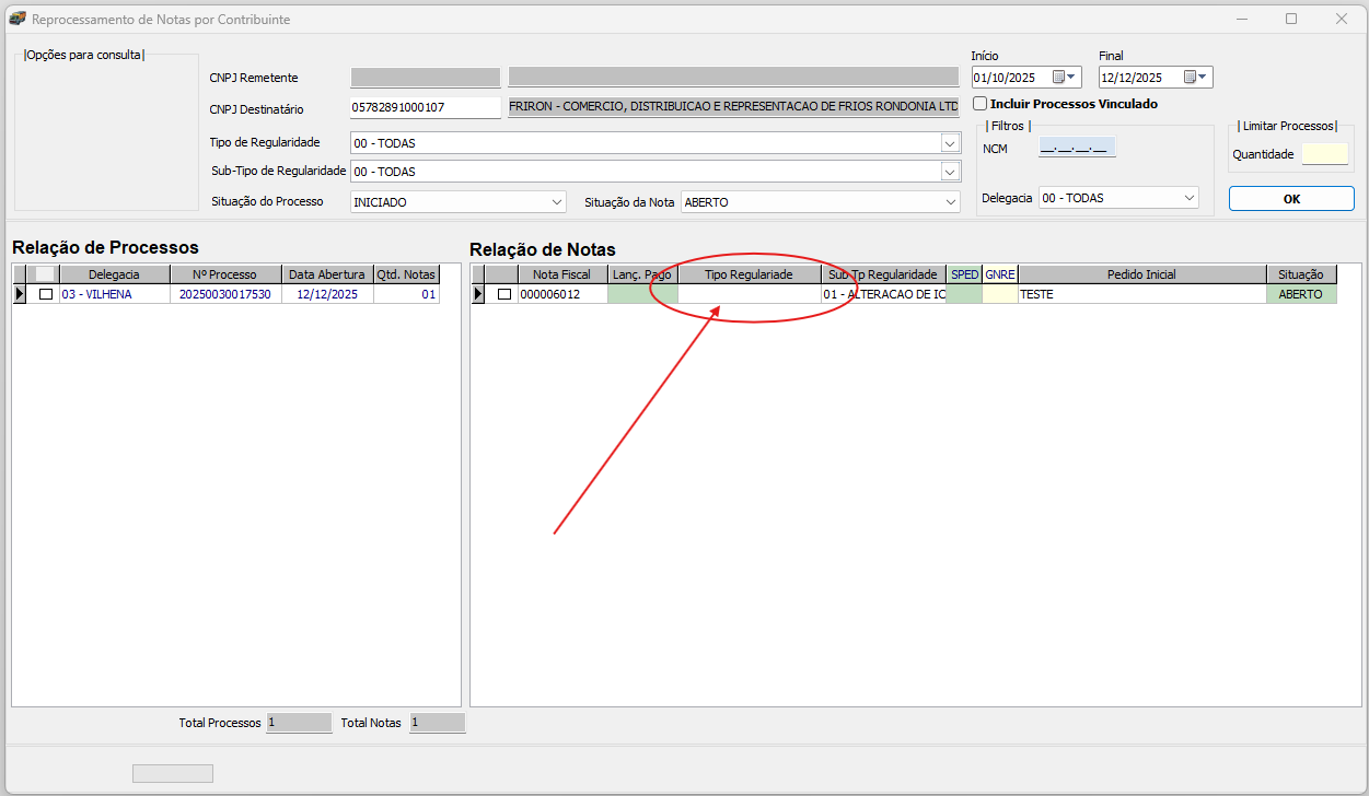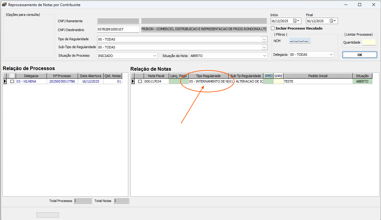 Ref.: Regularização Fiscal - Coluna "Tipo Regularidade" não carrega informação quando é processo de Internamento de NFE