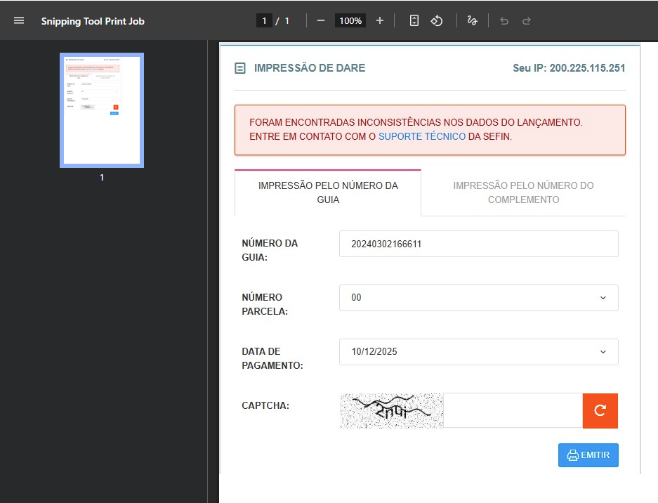 Usuária ANGELICA DE SOUZA ALMEIDA de CPF 003.868.262-18 informa que está tentando emitir um DARE em atraso para uma empresa cujo CNPJ encontra-se baixado. Até a semana passada, a emissão ocorria normalmente; porém, desde segunda-feira não é mais possível concluir o processo, sendo exibida a seguinte mensagem: ‘Foram encontradas inconsistências nos dados do lançamento. Entre em contato com o suporte técnico da SEFIN.’