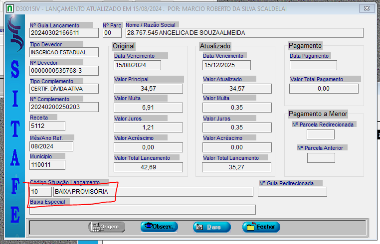 Estarei verificando se o portal do contribuinte realmente esta exibindo como pendente os lançamentos com baixa provisória.
