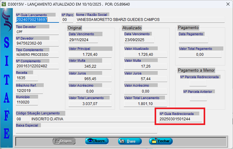 N30015FM: Imprimir dare parcialB30015F0: Valida pessoa