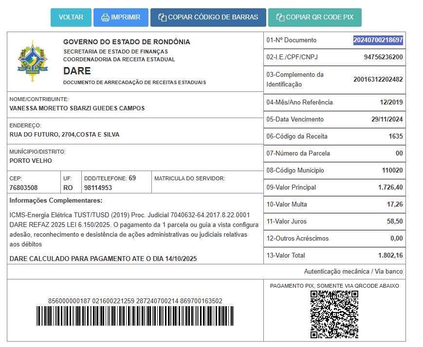 4) Os demais códigos podem ter a impressão do DARE realizada