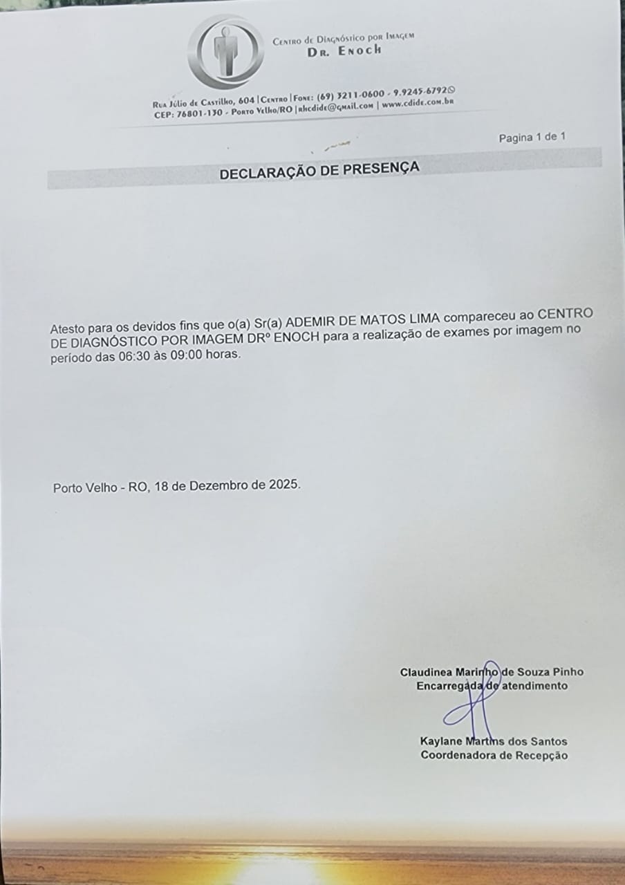 Conforme atestado de presença em anexo estive ausente de 7:30 às 9:00 realizando exame por imagem.