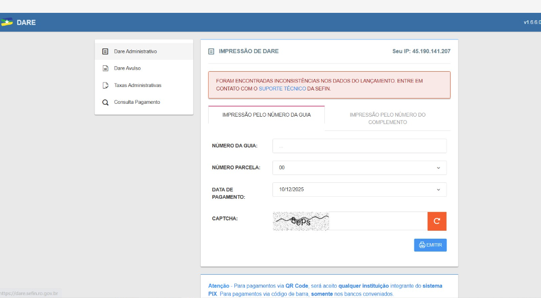 Usuária CARLA OLIVEIRA DA COSTA MORAIS Não estou conseguindo emitir o DARE de código 1662 na SEFIN. O sistema apresenta erro e orienta a entrar em contato com o suporte técnico.