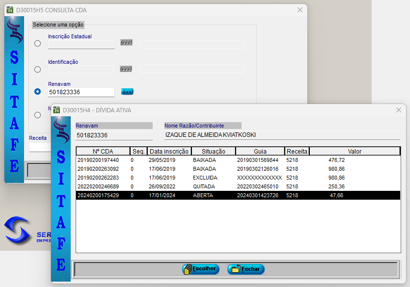 Não há débitos de IPVA em aberto no conta corrente do veículo RENAVAM 501823336, no entanto, quando consulto as CDAs pelo RENAVAM retorna o seguinte: