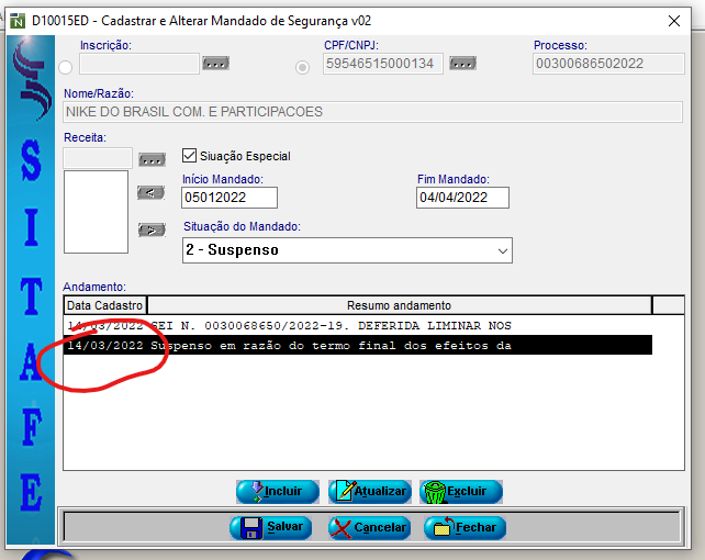 ao incluirmos novos registros de andamento de mandados no SITAFE (Arrecada > Mandado > Incluir/Alterar), a data desse novo registro coincide com a do primeiro dado inserido. Por exemplo: no dia 14/3/2022, realizamos a inserção do primeiro andamento processual; agora, em 3/5/2022, procederemos a inclusão de um novo movimento, todavia a data do registro permanece sendo 14/3, quando, a nosso ver, deveria trazer a data de 3/5. Para ilustrar, segue abaixo prints da tela: