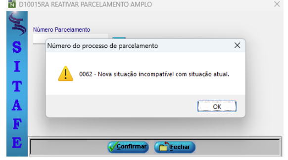 Ao tentar reativar o parcelamento está sendo demonstrada a mensagem de erro a seguir: