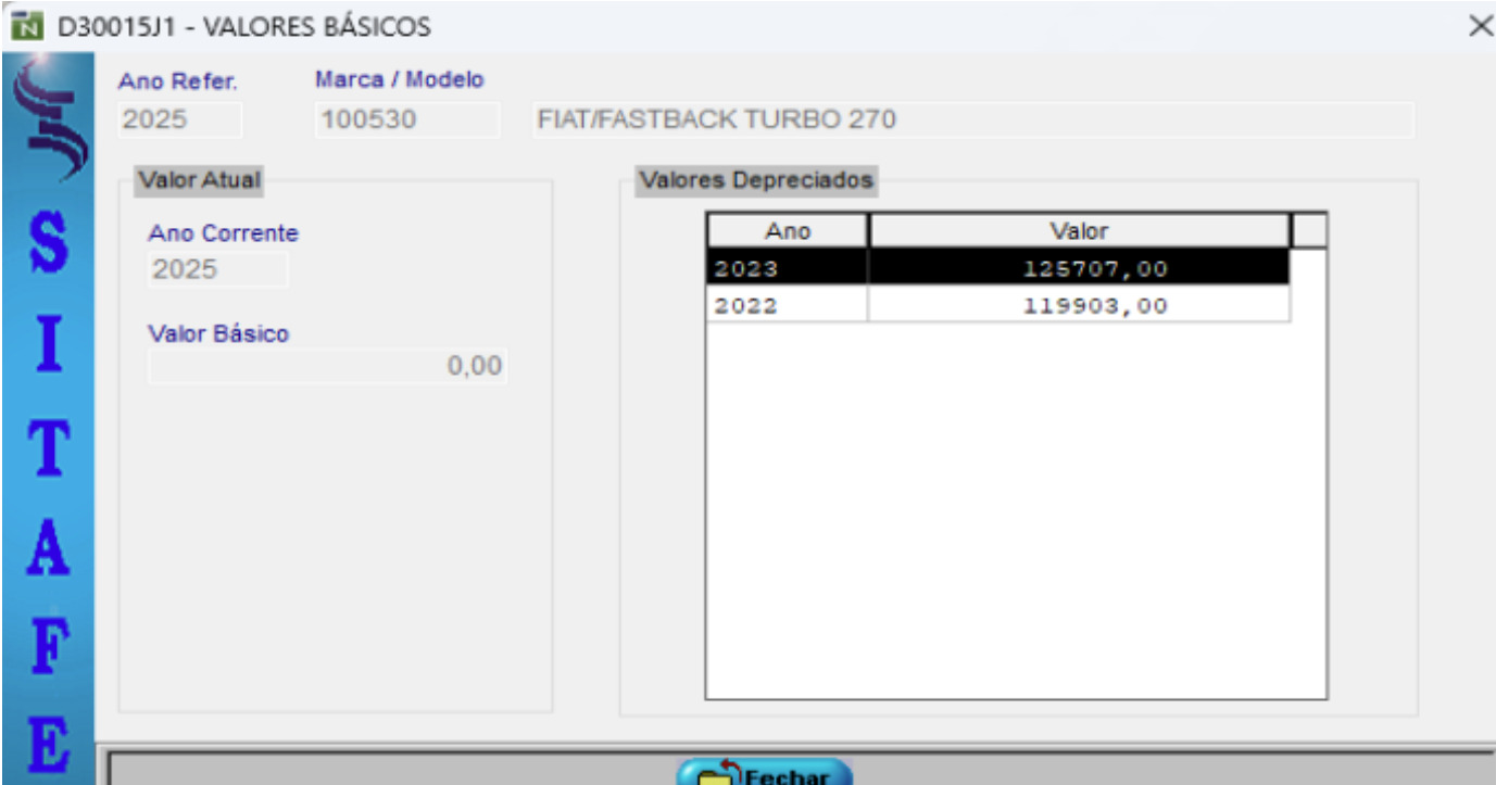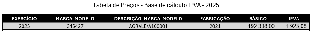 Salientamos que a tabela FIPE utiliza como parâmetro o ano de fabricação para definição do valor do veículo no exercício atual, conforme exemplo a seguir: