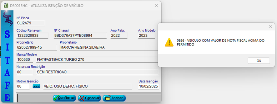 O.S. #00084140 - REJEIÇÃO DO SITAFE AO REGISTRAR ISENÇÃO IPVA PCD