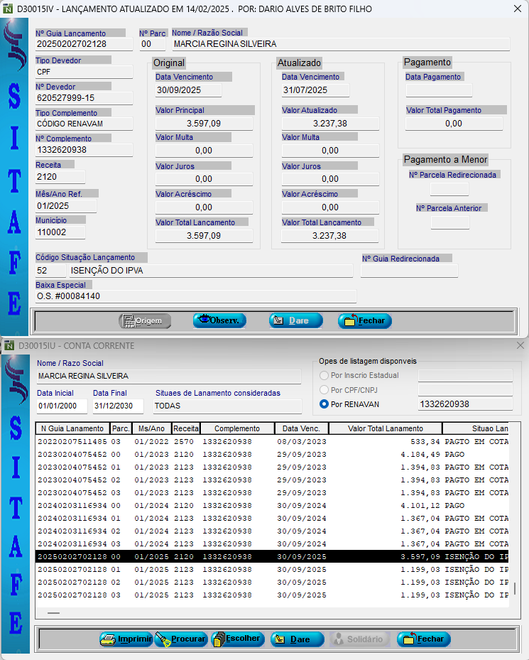 Como solução paliativa, procedemos com baixa manual do débito de IPVA 2025 do veículo, uma vez que já reconhecida a isenção.
