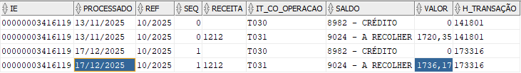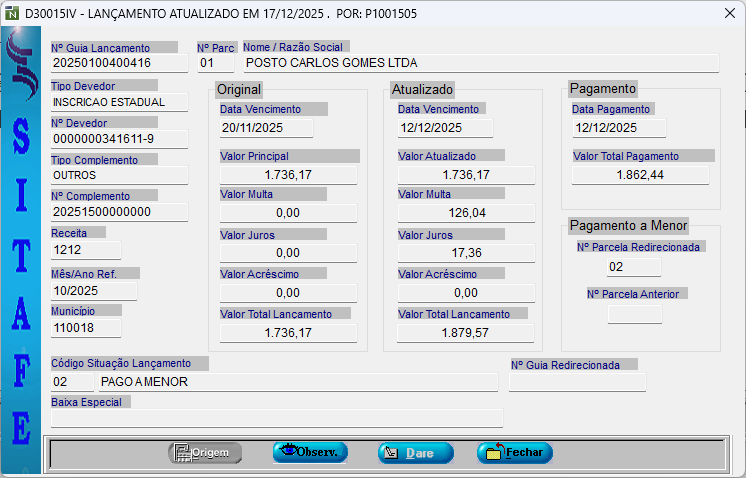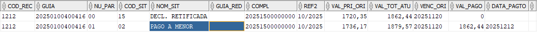 Em vez de promover a alteração do valor da guia de origem, o novo processamento gerou a parcela 01 da mesma guia.