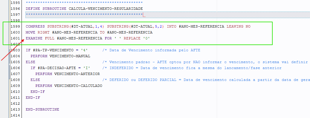 Na DEFINE SUBROUTINE CALCULA-VENCIMENTO, excluir o código onde é preenchida a variável #ANO-MES-REFERENCIA (linhas 1567 a 1569)