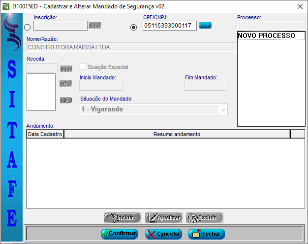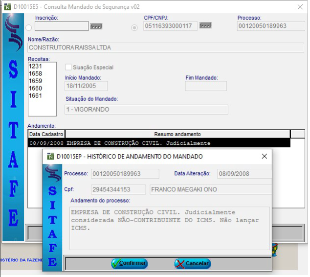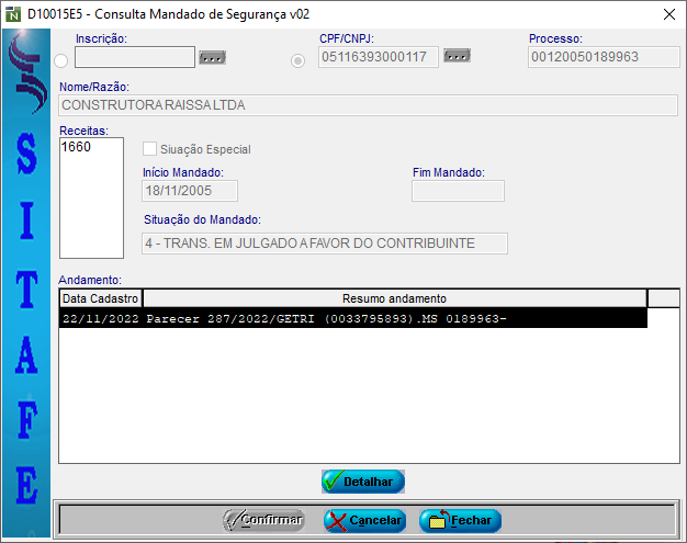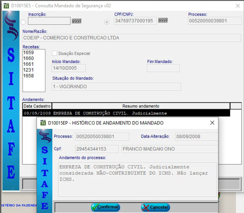 Ao alterar dados referentes aos campos "Situação do Mandado" e "Receita", bem como incluir novo "resumo do andamento", todos os dados referentes ao processo judicial sumiram da tela do SITAFE, apesar de constarem nas tabelas do banco de dados: "SITAFE.SITAFE_MANDADO_SEGURANCA" e "SITAFE.SITAFE_MANDAD_AO_IT_TX_RESUMO", por exemplo.