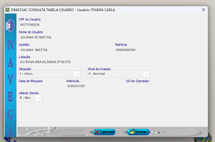 O SitafeWeb está com uma inconsistência para a nova usuária: