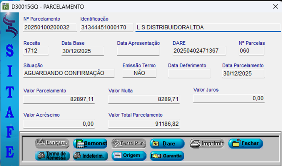 Assim, solicitamos excluir a taxa gerada na guia 20260400087613-99 do parcelamento 20260100100003 e executar a transação 007 para vinculação da arrecadação.