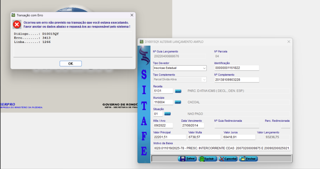 Ao tentar efetuar a alteração dos valores da guia 20220400888676-04 por meio da transação AUDITOR - AUDITOR - ALTERA LANÇAMENTO AMPLO está sendo demonstrada a mensagem de erro a seguir:
