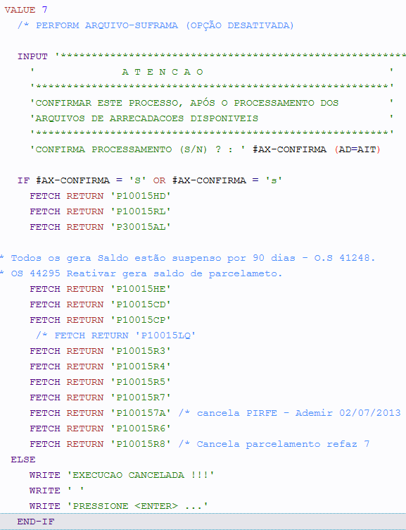 Foi realizada a análise e o levantamento dos programas vinculados à opção 07 do programa BACH O30015AC, responsáveis pelo módulo de processamento do parcelamento, visando identificar o problema relacionado à interrupção dos programas que não geram corretamente o saldo de parcelamento.