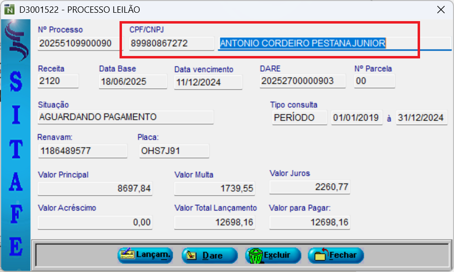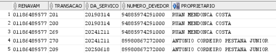 Como observamos, o DETRAN procedeu de forma correta ao cadastrar a transação 269 em nome do proprietário anterior: RUAN MENDONCA COSTA, CPF 94885974291; e as transações posteriores em nome do arrematante.