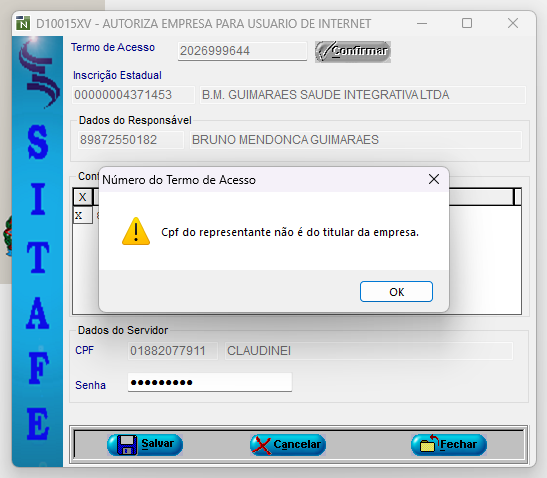 Ao tentar realizar a liberação do Termo de Acesso, o sistema exibe somente o CPF da pessoa (contador) no SITAFE e apresenta mensagem de erro. Além disso, as empresas envolvidas não aparecem na lista de empresas da contadora, impedindo a vinculação e, consequentemente, a liberação do Termo de Acesso. (conforme print/registro a ser anexado). O impacto é o bloqueio do processo de liberação de acesso via Termo de Acesso, dificultando o atendimento e a regularização de acesso de empresas por contadores, com potencial aumento de demandas operacionais e retrabalho no suporte. Como análise inicial, em conversa com Felipe Pessoa, foi sugerida a avaliação das alterações recentes em subprogramas relacionados ao fluxo do Termo de Acesso e à vinculação contador-empresa, bem como, se possível, o apoio do Cadastro para mapeamento e identificação de mudanças que possam ter ocasionado o comportamento atual.