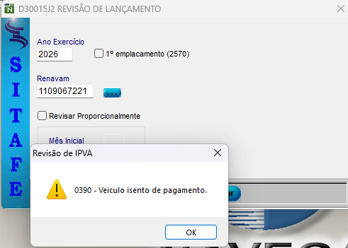 Contudo, não foi possível realizar o procedimento, em razão da mensagem apresentada pelo sistema indicando “veículo isento”.