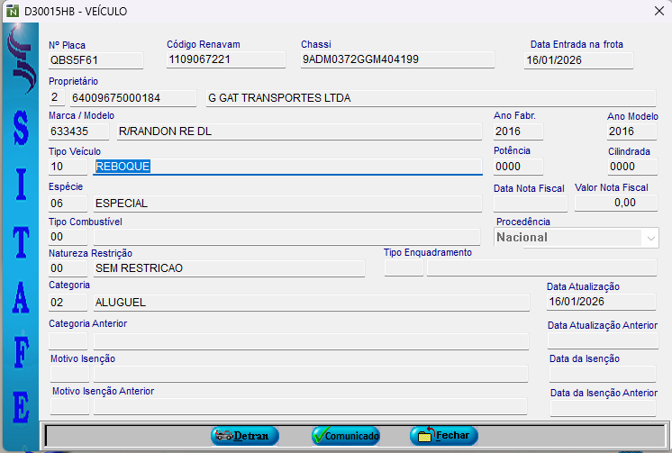 Após consulta, verificou-se tratar de veículo rebocado, sem tração própria, que depende de veículo trator para sua locomoção. Consta tentativa de registro de entrada na frota do Estado de Rondônia em 16/01/2026