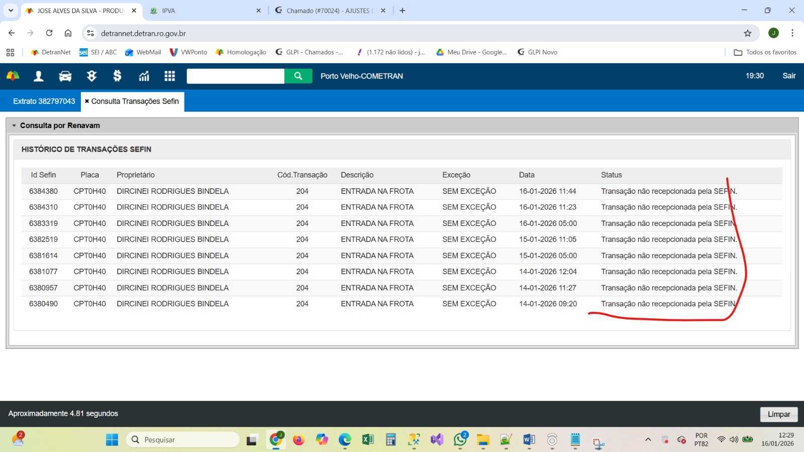 A SEFIN retornou para o DETRAN o mesmo código de erro em várias tentativas só que dia 14/01 o veículo foi cadastrado, verifica o motivo de ter acontecido isso. Mesmo depois do veículo na frota "Transação não recepcionada pela SEFIN"
