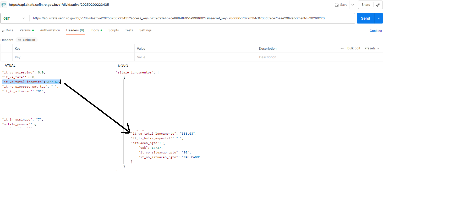 a api não está mais atualizando o valor, mesmo passando o vencimento 20260220 nos parametros lá em sitafe_lancamento o vencimento ainda ta 20251231 e o it_va_total_lancamento não está atualizando