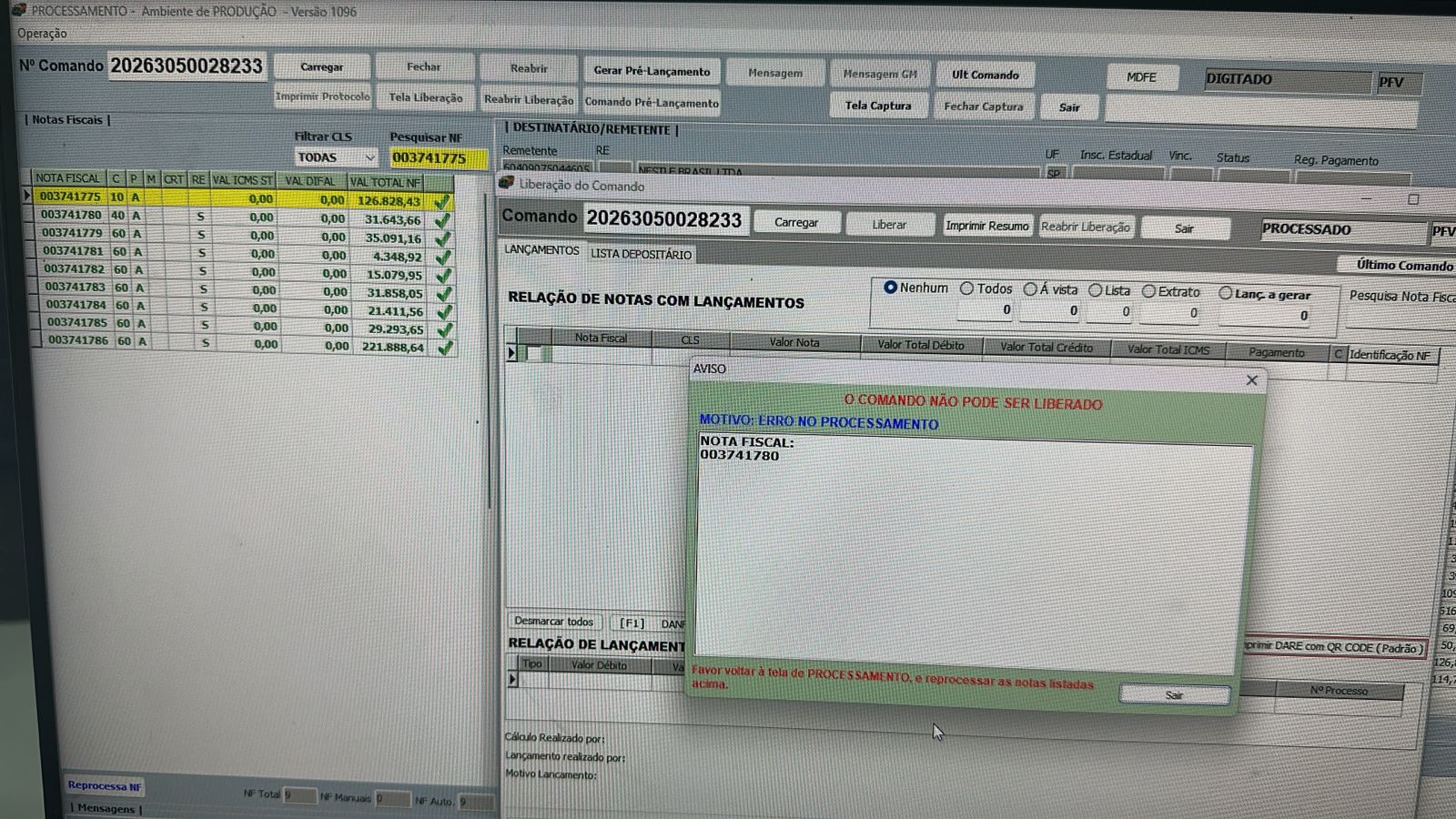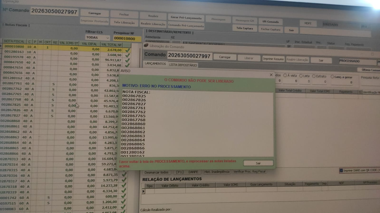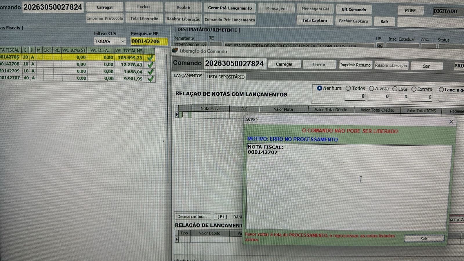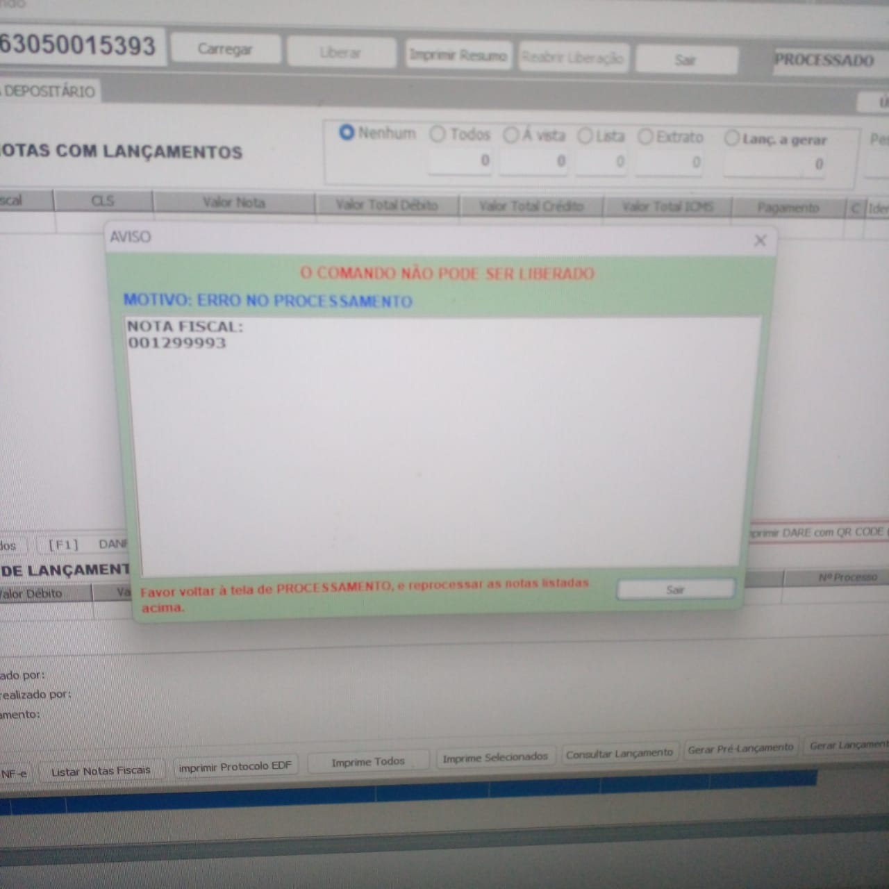 Porém, caso tenhamos algum problema de sistema entre os UPDATE's, ao carregar novamente o comando esta nota já não estará mais na fila de lançamentos pendentes, visto que houve alteração nos dados, e quando o usuário tentar liberar o comando, aparecerá a mensagem de ERRO NO PROCESSAMENTO, obrigando o usuário a retornar na tela processamento e realizar o reprocessamento das notas com problema.