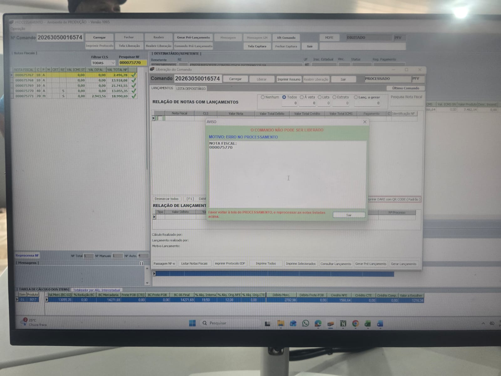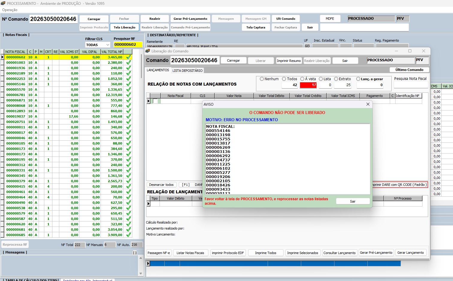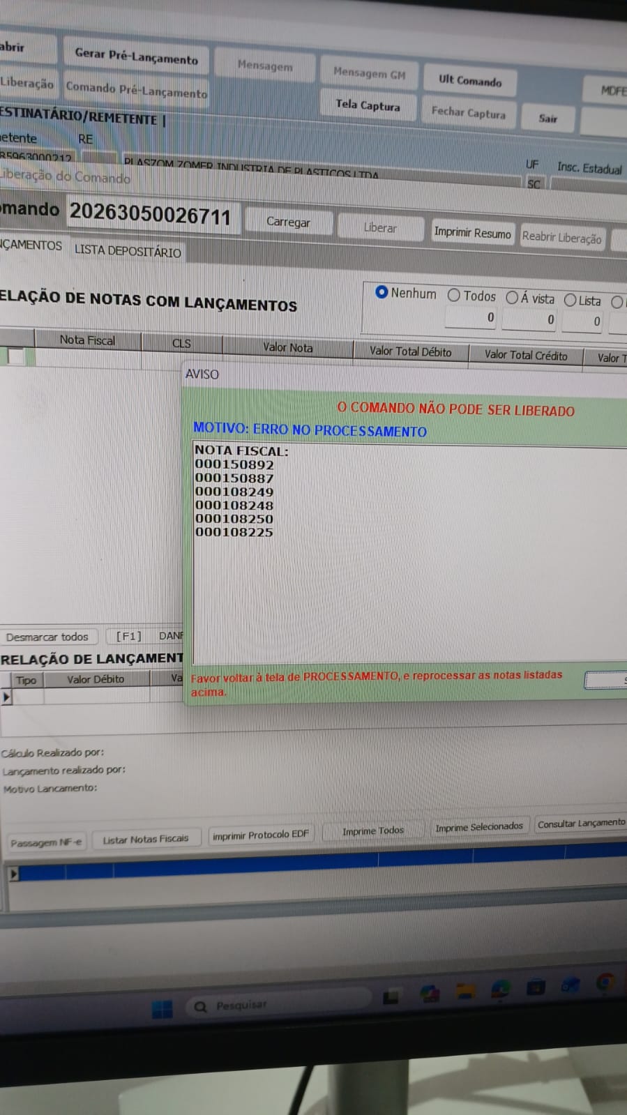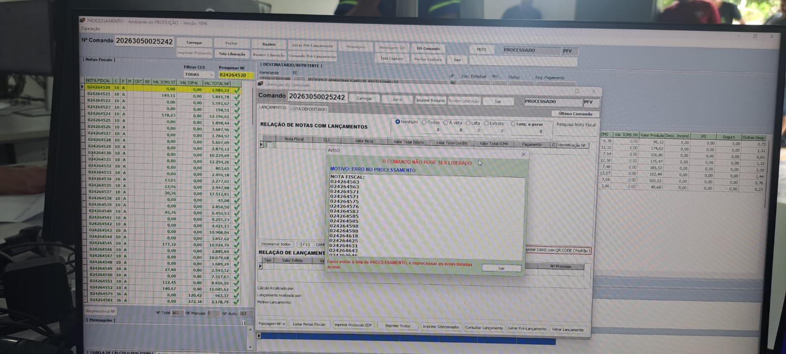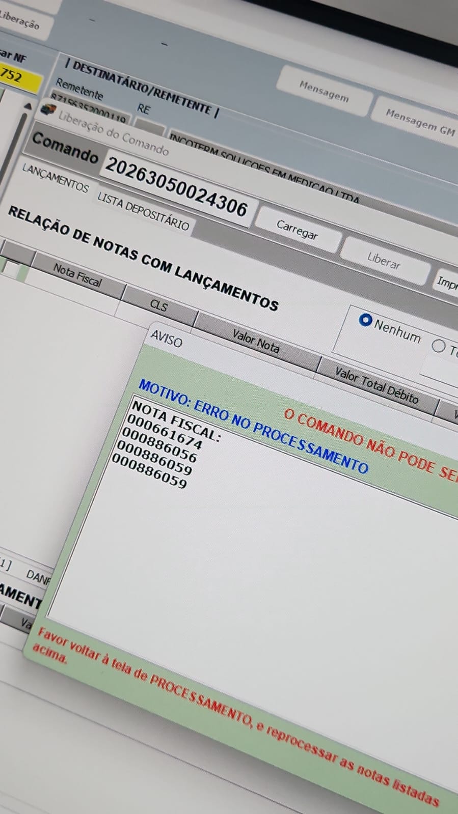 Porém, caso tenhamos algum problema de sistema entre os UPDATE's, ao carregar novamente o comando esta nota já não estará mais na fila de lançamentos pendentes, visto que houve alteração nos dados, e quando o usuário tentar liberar o comando, aparecerá a mensagem de ERRO NO PROCESSAMENTO, obrigando o usuário a retornar na tela processamento e realizar o reprocessamento das notas com problema.