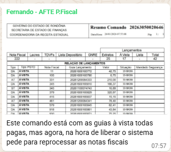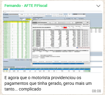 Posteriormente, quando o transportador apresentou estas 17 guias pagas, somente ao carregar o comando para fazer a liberação é que o sistema apontou o erro no processamento, e, ao realizar o reprocessamento e nova geração de lançamento a quantidade de lançamentos À VISTA subiu para 51, gerando atrito com o transportador, visto que teve que solicitar o pagamento do restante (Prints 02 e 03).