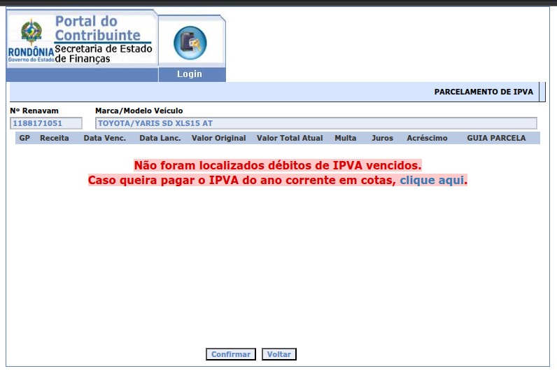 Quando não existirem débitos vencidos do exercício corrente, o sistema passa a exibir mensagem orientativa informando que o contribuinte pode pagar o IPVA do ano em cotas, com redirecionamento para a página de IPVA (impressão/geração das cotas), direcionando corretamente o usuário para o fluxo apropriado.