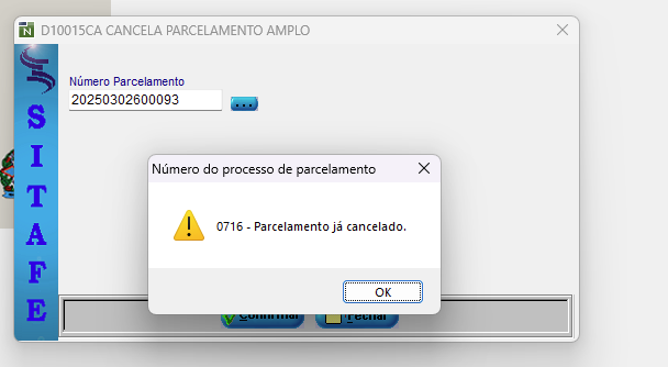 Ao tentar efetuar o cancelamento do parcelamento de dívida ativa n.20250302600093 a fim de que a origem (guia 20250301528223-00) retorne para não pago, está sendo demonstrada a mensagem de erro a seguir: