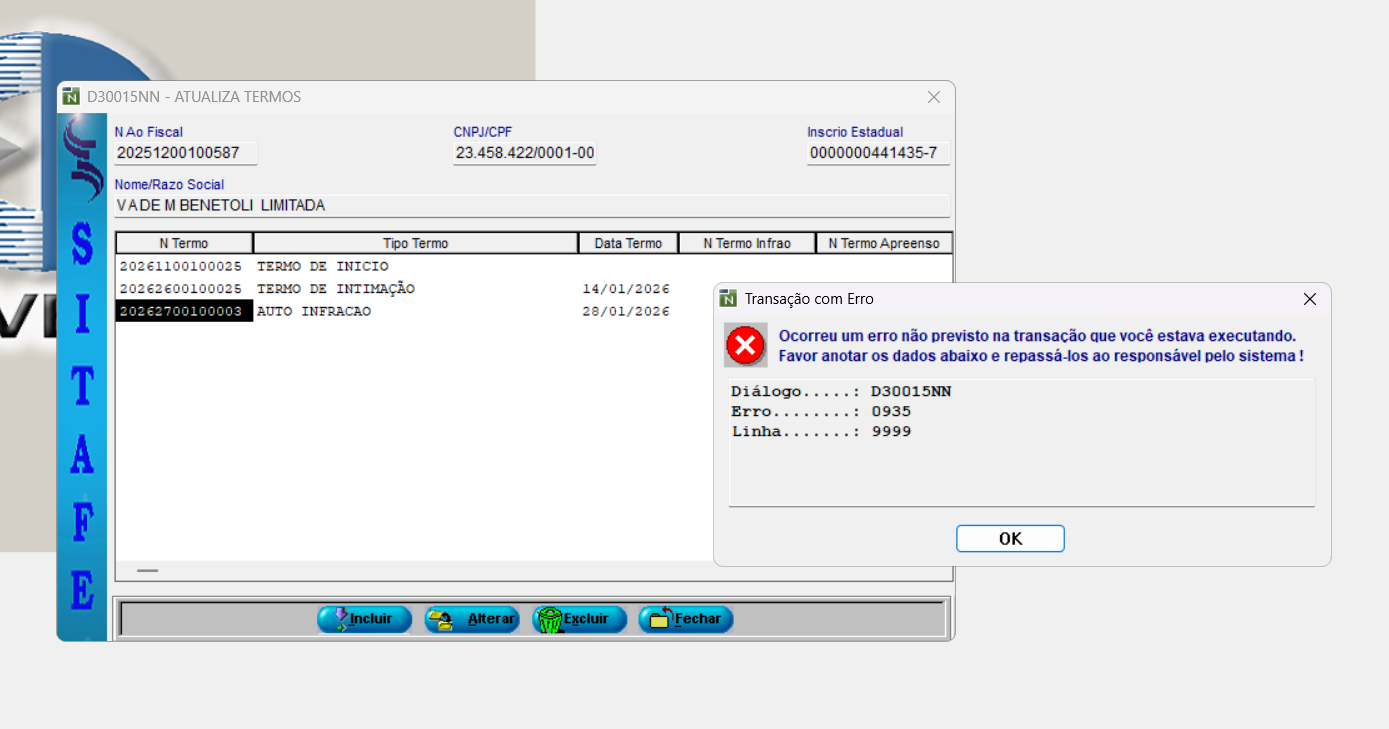Ao tentar alterar o auto de infração no modulo ACAO FISCAL, o sistema apresenta erro e fecha. O erro ocorreu inicialmente quando fui finalizar a lavratura do auto. agora nao consigo mais mexer em nada que o erro acontece.