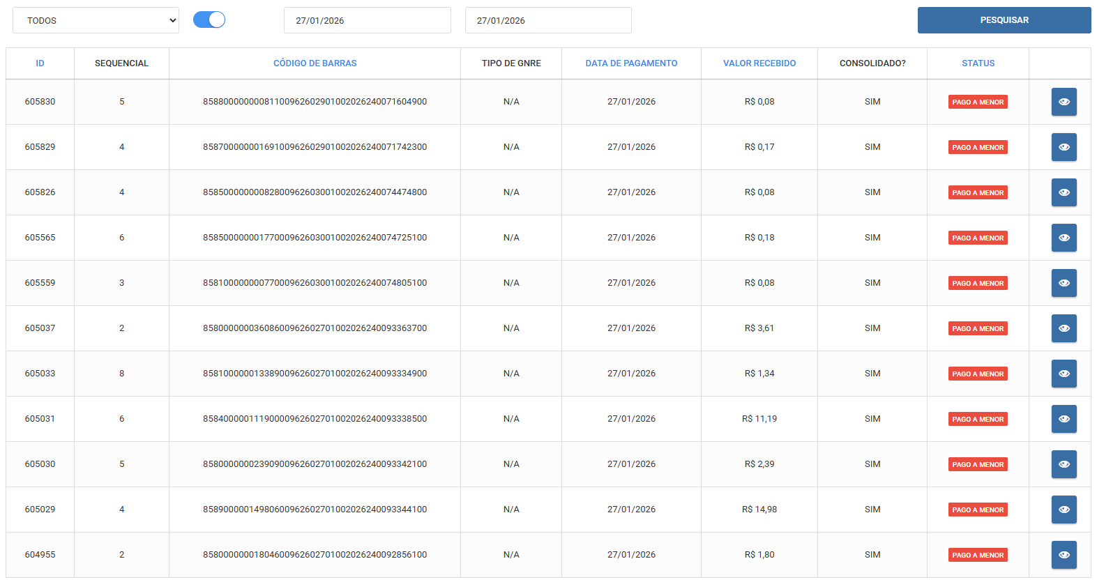 O.S. #00092134 - Arrecadação BB GNRE 27/01/2026 não processada.