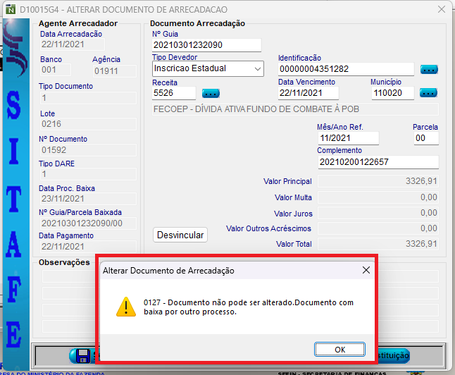 A GUIA 20210301232090 da CDA 20210301232090 está na situação 16-DIVIDA ATIVA EXCLUÍDA, no entanto possui vinculação de pagamento que deve ser direcionado para outra guia. Ao tentarmos efetuar a desvinculação, o SITAFE emite a seguinte mensagem: