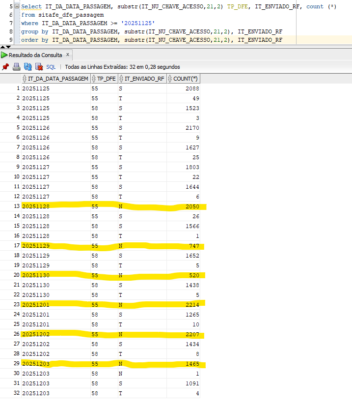 Este programa faz busca na tabela SITAFE_DFE_PASSAGEM para localizar documentos fiscais eletrônicos pendentes de envio de xml de evento de Registro de Passagem ou evento de Vistoria, sendo que temos dados de MDFE e de CTE nesta tabela.