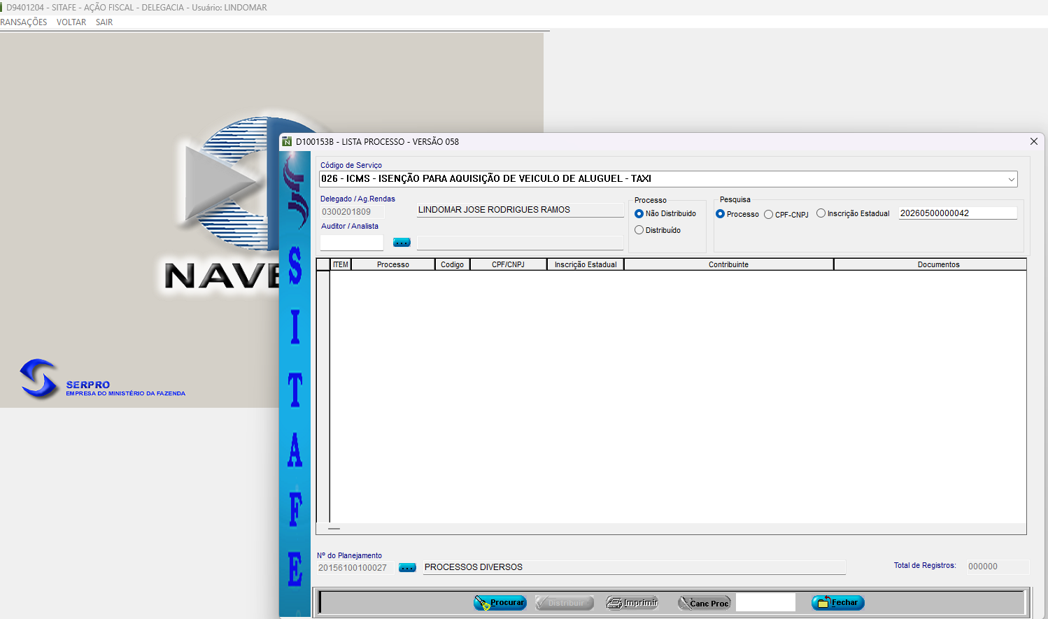 sou agente de rendas da agências de rendas de são Francisco do Guaporé, Não estou conseguindo distribuir processo de isenção de ICMS para taxi , o processo está na agência, porem quando distribuir ele não aparece na
