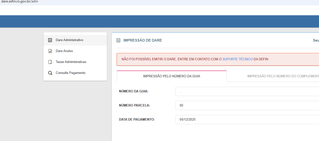 Ao emitir os DARE do auto 20252700300021, pelo link https://dare.sefin.ro.gov.br/adm, gera uma mensagem de erro.
