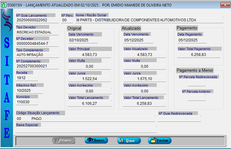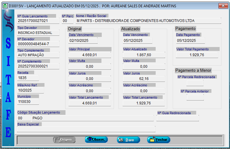 teste de impressão feito com outros autos de infração no portal e sitafe tanto pelo número da guia quanto pelo número do complemento não apresentam erros como demostrado na ordem de serviço que se refere ao auto de infração 20252700300021 que já se encontra na situação 00 pago.