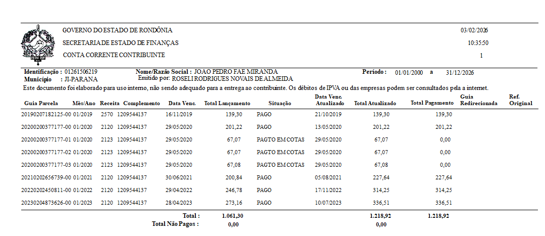 Verificou-se a existência de multas de trânsito associadas ao CPF do proprietário, caracterizadas como dívida ativa não tributária, indevidamente vinculadas ao RENAVAM do veículo. Diante disso, solicita-se a correção e a desvinculação dessas pendências, a fim de regularizar a situação do contribuinte e viabilizar a emissão do CRLV.