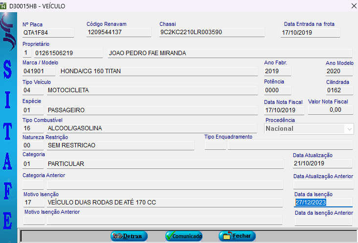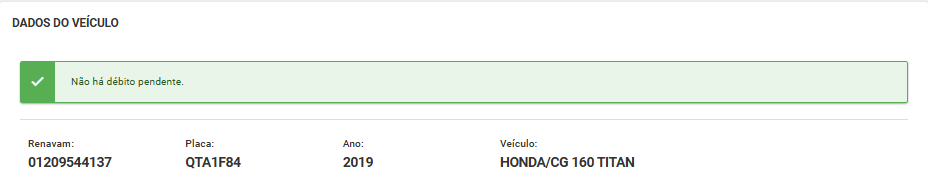 Não foram identificados débitos de IPVA em aberto referentes ao veículo em questão. Ressalta-se que o veículo tornou-se isento do pagamento de IPVA a partir de 2024, por possuir até 170 cc, sendo o último lançamento realizado no exercício de 2023.