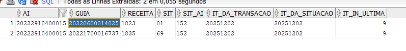 Tendo em vista o SEI 0030.010557/2025-68, solicito a análise se há impedimento de inscrição em dívida ativa no sistema https://dividaativa.sefin.ro.gov.br/, em função do AI 20222910400015 ter uma guia em aberto (20220600014025) e outra no cod de situação 69 (20221700016737), uma vez que o AI encontra-se em cod 152 no PAT, como abaixo visto: