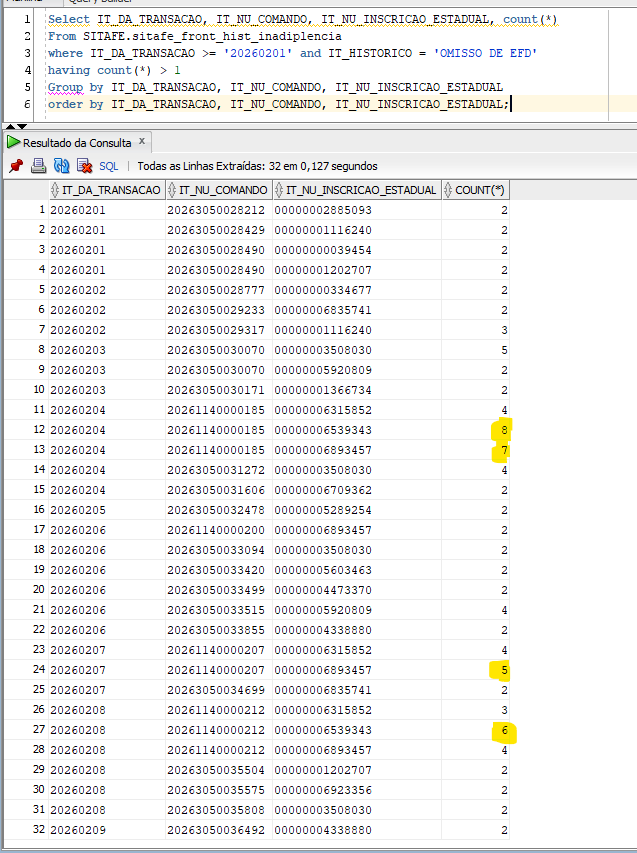 Porém, tenho verificado a ocorrência de duplicidades nesta gravação, conforme print de consulta ao banco de dados abaixo.