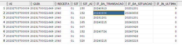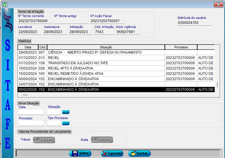 Solicito que o cod 152 seja inserido no PAT novamente para o AI 20232703700009, uma vez que foi verificado que a data de inclusão do cod 158 (20240913) ocorreu de forma posterior, mesmo que retroativa, ao cod 152 (20240606), assim ocasionando a última situação ao cod 158, o que por sua vez impede a inscrição do AI em dívida ativa, como abaixo demonstrado: