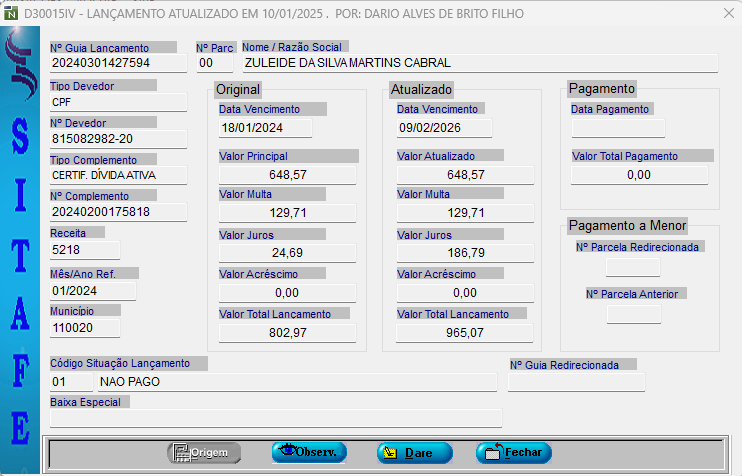 Após consulta à conta corrente do veículo, verificou-se que foram lançados os débitos de IPVA referentes aos exercícios de 2016 a 2020, o qual deu origem à CDA nº 20240200175818, com a respectiva guia nº 20240301427594.