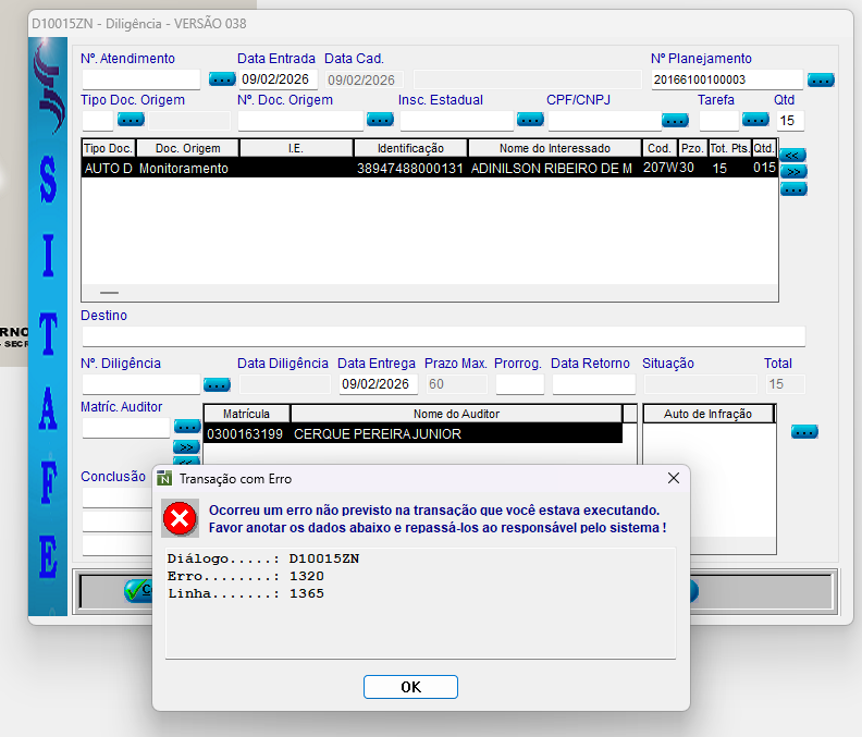 Favor verificar o erro apresentado ao solicitar abertura de DSF no ação fiscal.