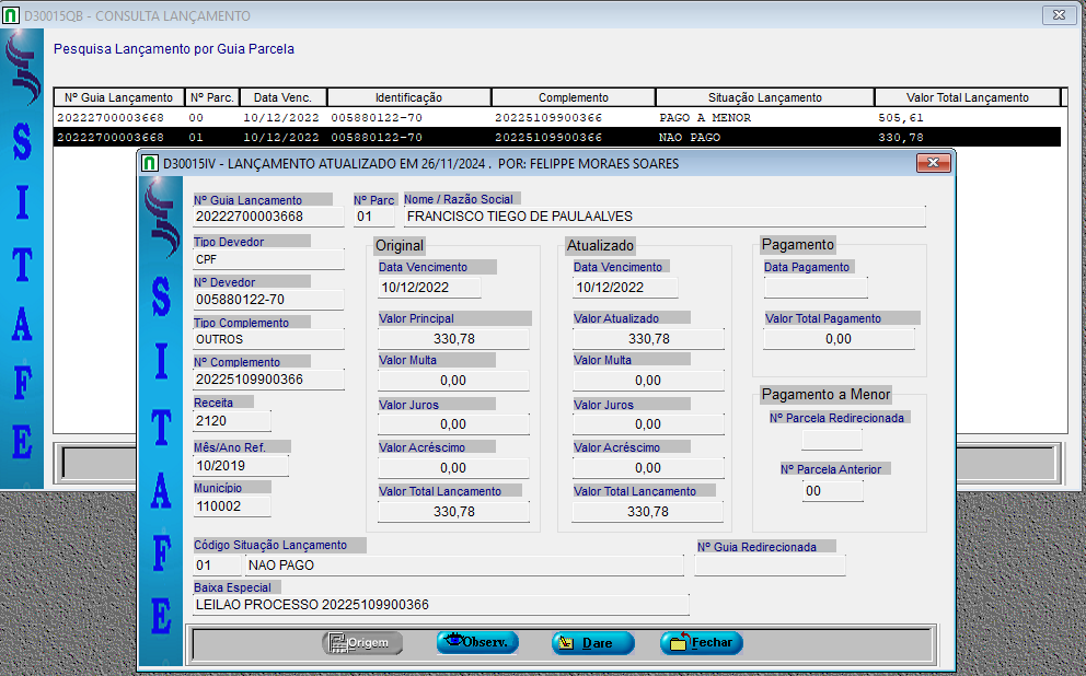 Adicionalmente, foi realizado teste na situação de pagamento do veículo consultado pelo DETRAN, com o objetivo de verificar a existência de débitos em aberto. No momento, o IPVA 2026 consta na situação Não Pago, caracterizando-se como débito a vencer. Ressalta-se que os débitos em aberto referentes ao leilão não serão considerados como débito deste devedor.