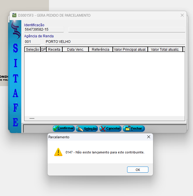 Foram feitas simulações na tentativa de gerar o parcelamento e aparece a mensagem não existe parcelamento para esse contribuinte . Houve tentativa de simulação pelo site da Sefin e também não foi possível